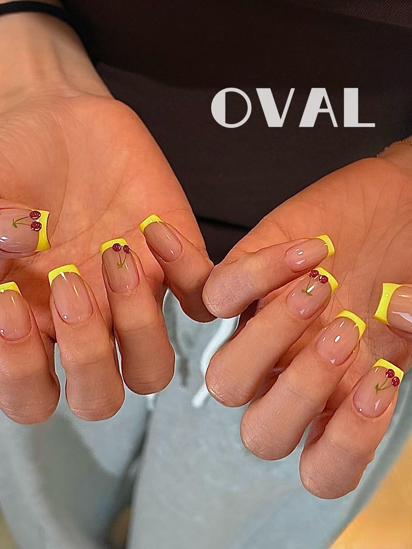 [Cure in 40s with Lamp] Hailey-Style Yellow Cherry French Tip Gel Nail Wraps (Oval Shape) – 20pcs Self-Adhesive, Instant Hardening Nail Tips