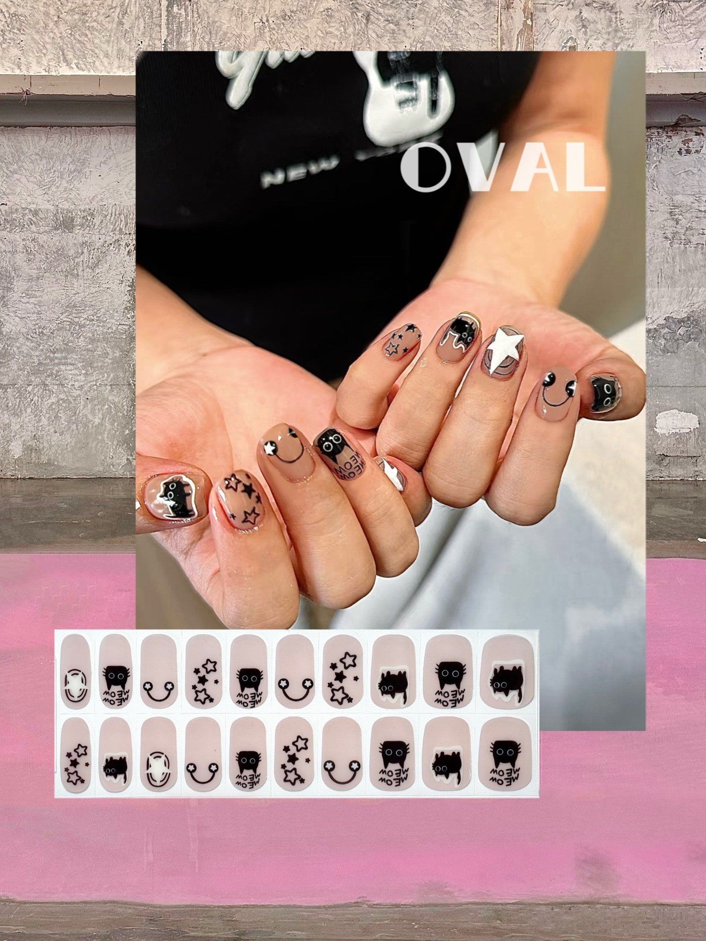 Featuring a translucent nude base paired with dark-sweet cat, star, and smiley designs, it’s your instant “playful quirky filter”—whether you’re styling an edgy hoodie or dark aesthetic fits, your nails will exude lively, eye-catching charm that’s perfect for Y2K and edgy-cute aesthetics